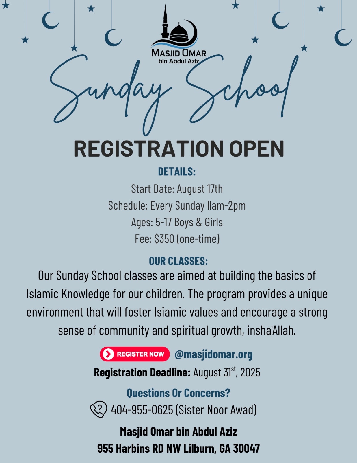 Sunday, August 31, 2025 9:20 amMasjid Omar's Sunday School is CLOSED TODAY due to Labor Day.