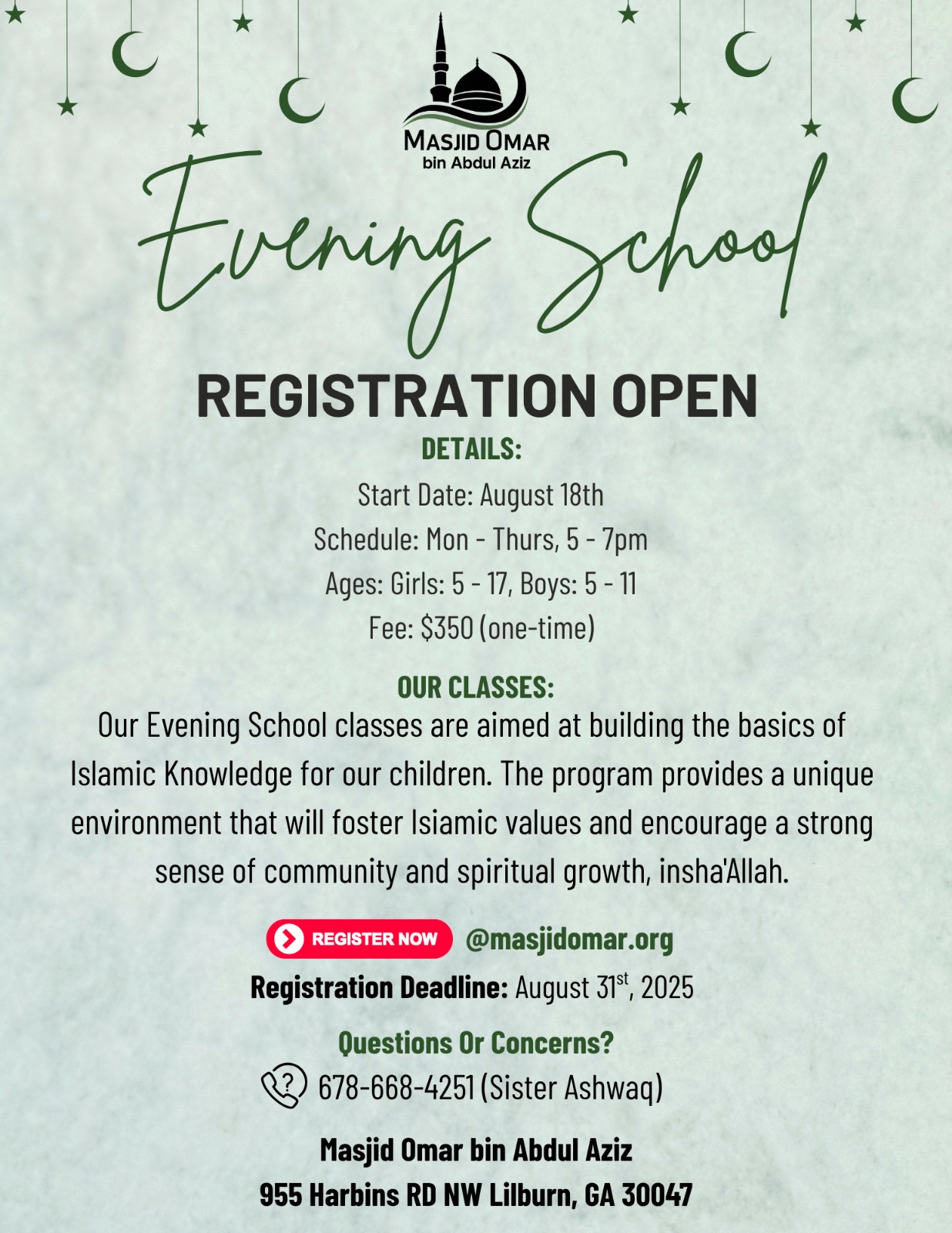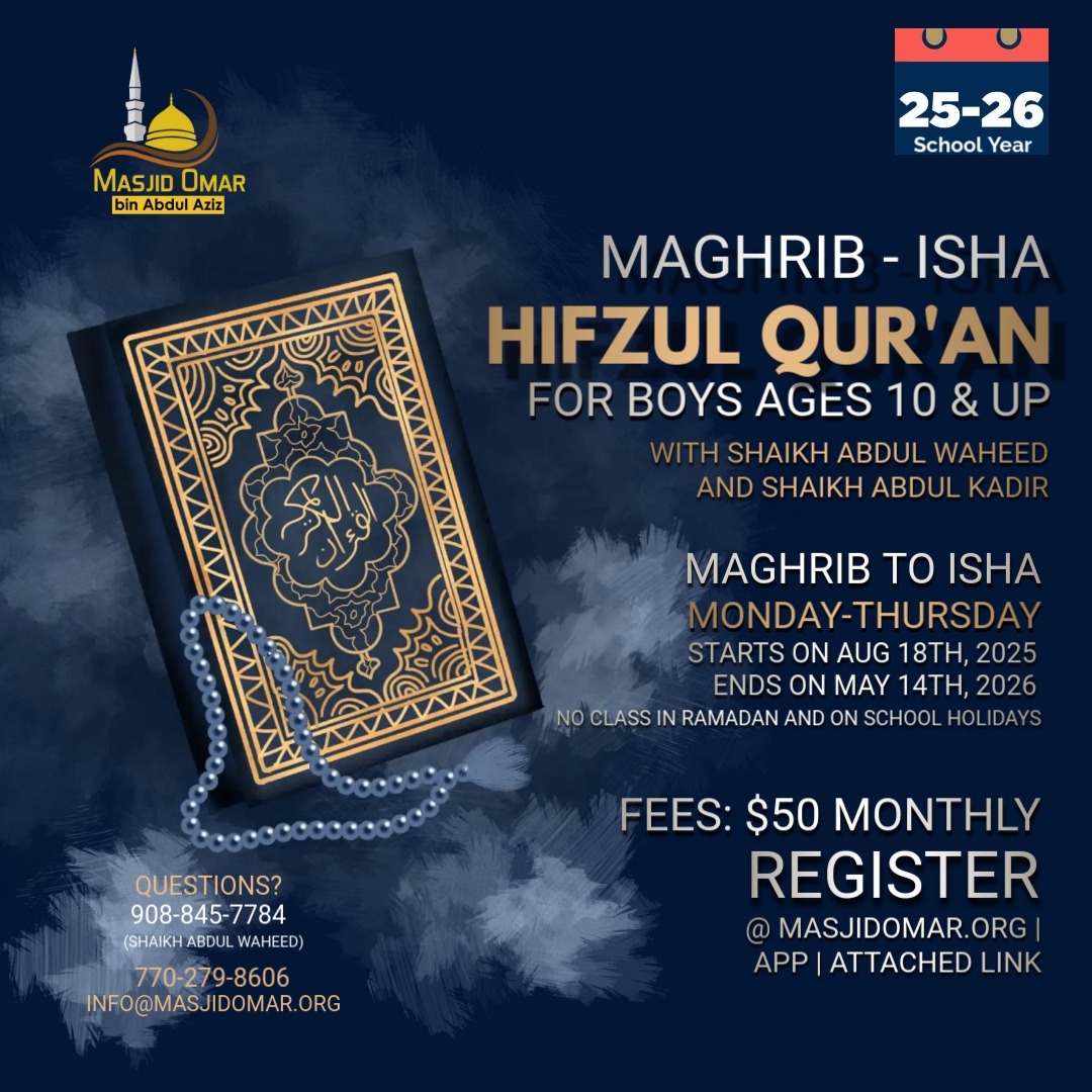 Registrations are now open for Maghrib to Isha Boys’ Hifz Class at Masjid Omar. More details are in the attached flyer.