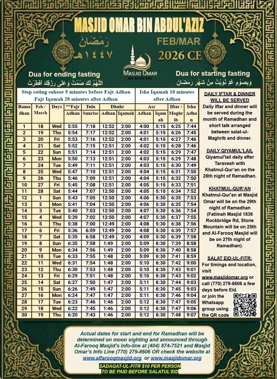 Tuesday, February 17, 2026 6:44 pmRamadan Mubarak! Wednesday, February 18th, will be the 1st day of Ramadan. Insha’Allah, we will commence the 1st Taraweeh tonight (Tuesday). Isha Iqamah tonight is at 8:00 PM.