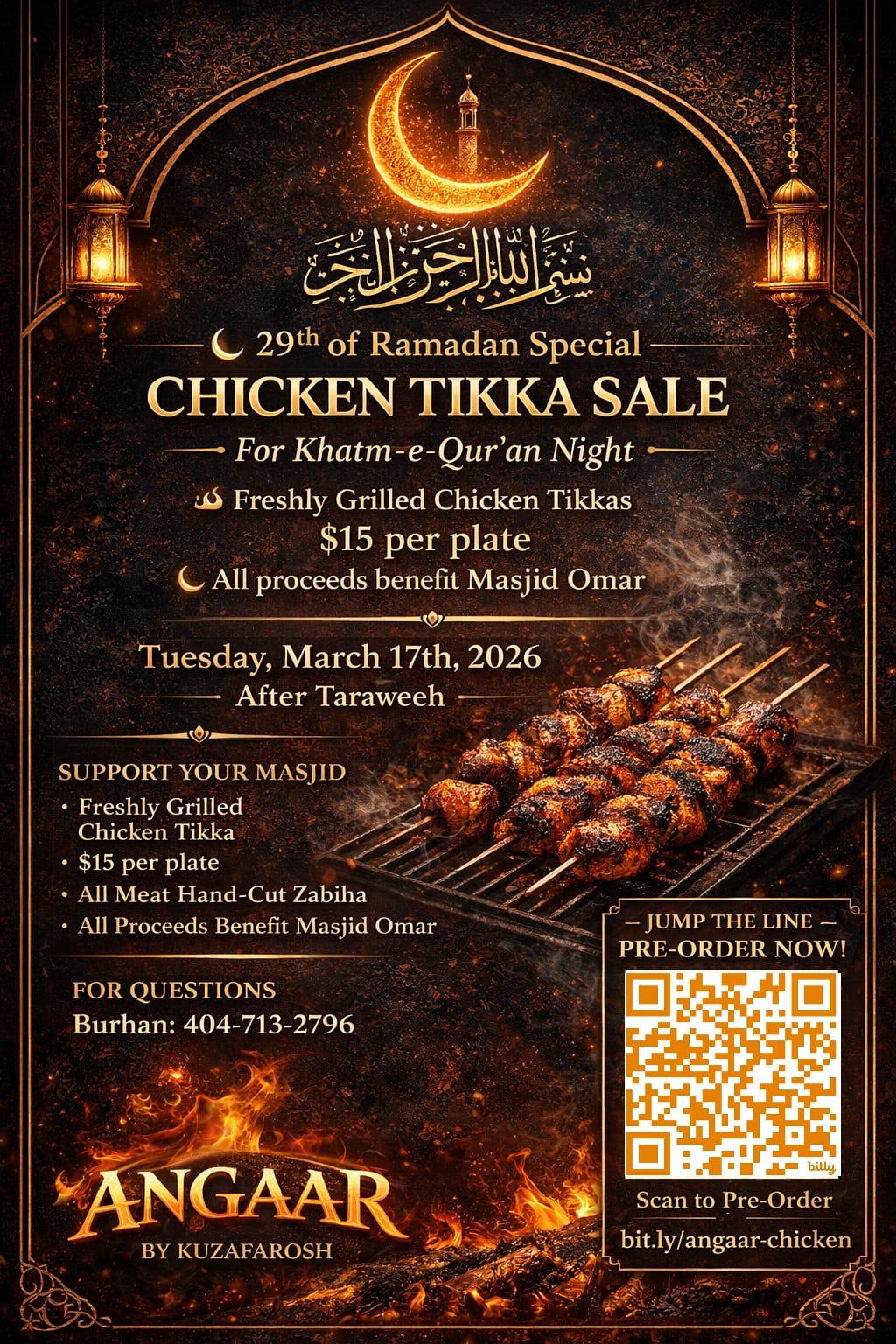 Join us for *Khatmul Qur’an at Masjid Omar* with freshly grilled, hand-cut zabihah Chicken Tikka!