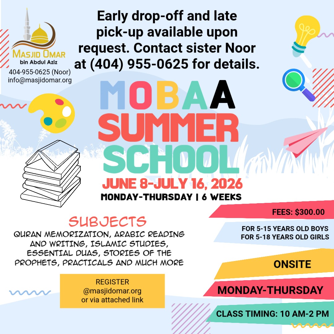 Friday, April 3, 2026 8:34 amJoin Masjid Omar's Summer School and make this Summer meaningful, educational, and fun!