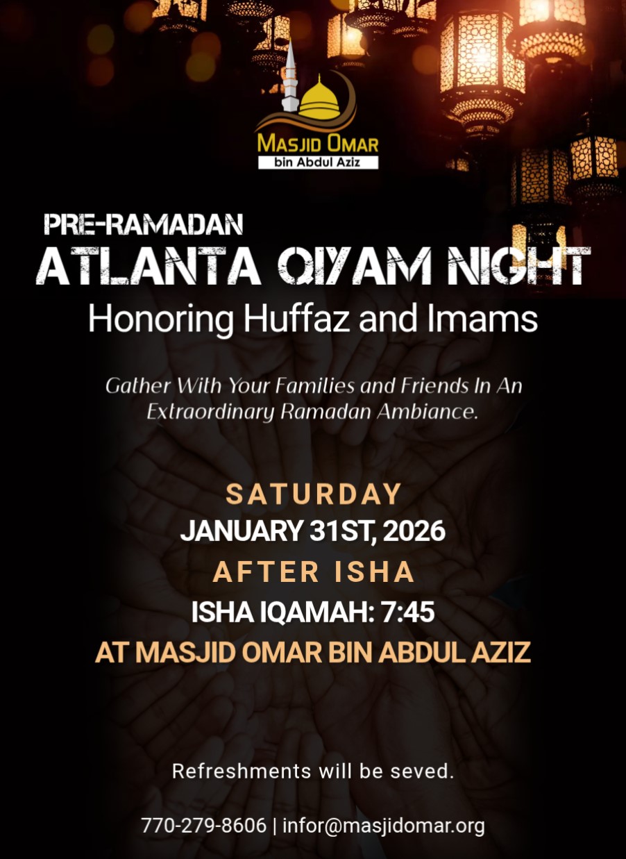 Monday, January 19, 2026 2:04 pmJoin us with your families and friends for a special night of worship as we prepare our hearts for Ramadan. Imams from all over Atlanta will lead us in Qiyam, filling the night with their beautiful and soul-stirring recitations of the Qur’an followed by a collective heartfelt Du’a. Young Huffaẓ will also recite the Qur’an, showcasing the next generation of Qur’an carriers.